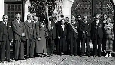 Following its involvement in the work to recover and honor the remains of soldiers killed in battle, SONFR found itself locked in a bitter rivalry with the Cultul Eroilor ("Heroes' Cult") organization, although Cantacuzino served on the leadership boards of both organizations.[58] According to historian Maria Bucur, Cantacuzino embarked on "a two-decade struggle to become the custodian of the public remembrance of the war."[59] The way Cantacuzino saw it, the reburial of bones was an essentially female-and-Orthodox task, since women were traditionally experts in parastas services. On such grounds, SONFR secured a virtual monopoly over the projects to honor those fallen in the Battle of Mărășești, their identification, and their annual commemoration.[60]