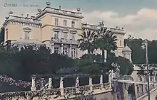 After their father's succession as Grand Duke upon the death of his father on 15 April 1883, Alexandrine grew up with her brother and sister at the Castle in Schwerin, at the royal residences of Ludwigslust Palace and the Gelbensande hunting lodge, only a few kilometres from the Baltic Sea coast.[3] Her father had a fragile health and suffered badly from dermatitis, asthma and respiratory disorders from an early age. The wet, damp, and cold Northern European climate of Mecklenburg was not good for his health, and as a result, Alexandrine spent a large amount of time with her family away from Mecklenburg, by the Lake Geneva, and in Palermo, Baden-Baden and Cannes in the south of France, where the family owned a large estate, the Villa Wenden.[1] Cannes was favoured at the time by European royalty, including some whom Alexandrine met such as Empress Eugénie of France and her future husband's uncle, Edward VII of the United Kingdom.