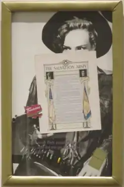 Smith combines text and imagery from a variety of sources to explore the psychology of the American identity.[9] She has drawn elements for her collages from pop culture, movies, romance novels, magazines, and advertising,[10] as well as the fiction and nonfiction works of a wide range of writers including Walt Whitman, Gertrude Stein, Thomas Mann, and Raymond Chandler.[11] Hollywood stories, the celebrity culture, advertisements, and Hollywood memorabilia figure frequently in her work, in part due to her upbringing in Los Angeles.[12] To Smith Hollywood is a place fraught with symbols and redolent with possibility, which engenders a different concept of art than that on the East Coast[3][13]