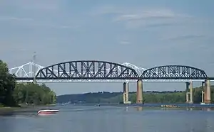Foreground: Alfred H. Smith Bridge; Background: Castleton Bridge. Seen from the west shore, south of the bridges.