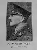 Rose was commissioned in the Essex Yeomanry on 21 October 1914.[8] He fought at the Battle of the Somme in 1916 and was awarded the Military Cross for action during the Battle of Arras in 1917.[9] He became Adjutant to his Regiment and in 1918 he transferred to Staff College at which point he was attached to the Royal Air Force.[10] After serving for almost the entirety of the War relatively unscathed he succumbed to influenza and died at the Hermitage RAF Hospital in Hastings on 29 October 1918.[11]