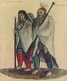 Algonquin couple, 18th-century watercolor. The first Algonquian encountered by the French were the Kitcisìpiriniwak ("Ottawa River Men"; singular: Kitcisìpirini), whose village was located on an island in the Ottawa River; the French called this group La Nation de l'Isle.