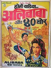 Alibaba And 40 Thieves (Alibaba Aur 40 Chor) is a 1954 Hindi fantasy action film directed by Homi Wadia. The film was a Basant pictures presentation under the Wadia Brothers Production banner.[1] The story, screenplay and additional dialogue were by J. B. H. Wadia, while the dialogues were written by Chand Pandit and Tahir Lucknavi.[2] The art direction and special effects were by Babubhai Mistry. The music was composed by Chitragupta and S. N. Tripathi. Chitragupta had worked as an assistant to S. N. Tripathi in some of the mythology and fantasy films before branching out on his own. The lyricist was Raja Mehdi Ali Khan.[3] It stars Mahipal, Shakila in the lead roles, with S. N. Tripathi, B. M. Vyas, Sharda, Lalita Kumari and Helen.[4]
