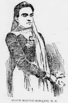 Alice Sorabji attended her family's Victoria High School in Poona, and earned a bachelor of science degree at Wilson College in Bombay, the first woman to earn that degree in India.[3][4] She was trained as a physician in London, with her older sister Cornelia's encouragement and efforts,[5] completing her studies in 1905.[2]