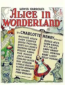 Alice in Wonderland is a 1933 American pre-Code fantasy film adapted from the novels by Lewis Carroll. The film was produced by Paramount Pictures, featuring an all-star cast. It is all live action, except for the Walrus and The Carpenter sequence, which was animated by Harman-Ising Studio.[1]