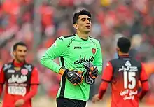 Beiranvand has played with Naft Tehran since 2011.[10] He made his debut in the Hazfi Cup against Damash on 25 October 2011.[11] There were links between him and the red half of Tehran, Persepolis, but the chairman of Naft Tehran, Mansour Ghanbarzadeh, did not allow him to leave the club.[12] In his first year as the first-choice goalkeeper, Beiranvand led the team to a 3rd place League finish and a spot in the AFC Champions League for the first time in the club's history. On 23 March 2014, he extended his contract with the club until June 2019. On 24 November 2014, Beiranvand provided an assist in their match against Tractor Sazi by throwing the ball into the opponent's half.[13]