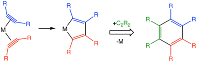 An alkyne trimerisation is a [2+2+2] cycloaddition reaction in which three alkyne units (C≡C) react to form a benzene ring. The reaction requires a metal catalyst. The process is of historic interest as well as being applicable to organic synthesis.[1] Being a cycloaddition reaction, it has high atom economy. Many variations have been developed, including cyclisation of mixtures of alkynes and alkenes as well as alkynes and nitriles.