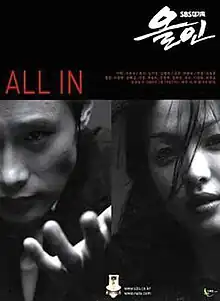 All In (Korean: 올인; RR: Orin; MR: Orin) is a 2003 South Korean television drama series that aired on SBS from 15 January to 3 April 2003, on Wednesdays and Thursdays at 21:55 (KST) for 24 episodes.[1] Inspired by the life of professional poker player Jimmy Cha, it starred Lee Byung-hun and Song Hye-kyo in a story about one's man's rise through the fiercely competitive world of casino gambling as he clashes with his rivals over money, success, and love.[2]