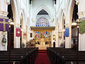 Inside the church are six-bay arcades carried on quatrefoil piers. The roof is coffered. There are corporation stalls of 1850.[2] The reredos and pulpit were designed by Paley. The font has an octagonal bowl with a quatrefoil frieze and incorporates a fragment from the 14th or 15th century. The chancel screen of 1901 was designed by W. D. Caroe. Built into the splay of a north window is a Roman altar. The stained glass includes fragments in the north window dating from the 15th century, that were reassembled in 1956–57 under the direction of Eric Milner-White. Elsewhere are 19th-century windows by William Wailes, Heaton, Butler and Bayne, Hardman & Co., Lavers and Barraud, Clayton and Bell, and Burlison and Grylls. The monuments include a couple in the south chapel that are badly defaced. These are considered to be effigies of Sir William de Bradshaigh, who founded a chantry in the church in 1338, and his wife, Mabel. The female effigy was re-cut, and the male effigy was copied, by John Gibson in about 1850. There are also memorials to James Bankes, who died in 1689, and John Baldwin, who died in 1726. On the east wall of the chapel are marble monuments to the 23rd Earl of Crawford, who died in 1825, and his wife, and to the wife of the 24th Earl of Crawford who died in 1850.[4] There is a ring of ten bells, all cast in 1935 by John Taylor & Co of Loughborough.[8]