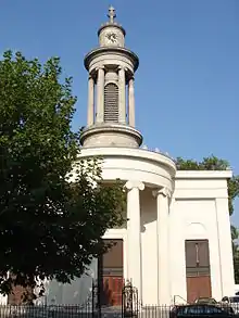 The church was built between 1822 and 1824 and was known as first as the Camden Chapel, then, unofficially, as St Stephen's. It did not receive the dedication of All Saints until 1920.[1] It was designed by the father and son team of William and Henry Inwood who were also responsible for St Pancras New Church. It is a fairly large building of yellow stock brick, with east and west ends faced in Portland stone. The plan is basically rectangular, with an eastern apse mirrored by a semi-circular portico at the west end. Just behind the portico is a cylindrical stone tower surrounded by columns, in imitation of the Choragic Monument of Lysicrates in Athens. The Ionic order is based on fragments brought back from Greece by Henry Inwood and now in the British Museum. The interior has a flat ceiling, with galleries on three sides supported by Ionic columns.[2] The building has generally been praised, but both contemporary writers and later architectural critics such as Sir John Summerson have argued that the tower is too thin in proportion to the body of the church. It is a Grade I listed building.