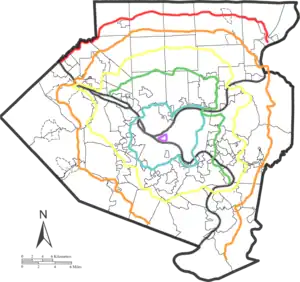 The Orange Belt is longest belt in the system, running 91.7 miles (147.6 km).[5] For most of its route, it is the outermost route in the system, except for the north of the county, where the Red Belt runs. The Orange Belt was originally a complete circle until a 12-mile (19 km) stretch in the south from Bethel Park to Forward Township was decommissioned (See decommissioned Orange Belt segment below).