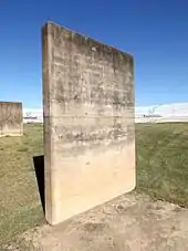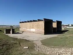Of the two walls built to protect workers in the two open testing stands constructed in 1943, only one remains standing. The control cabin that served both stands is built of concrete, while two distinct, raised platforms on each side of the control cabin, both with the circular footprints of the barrel-type stands, attest to the position of the test engines. Oil residue indicates the position of the propeller arc.[1]