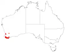 Karri oak is restricted to the southwest of Western Australia in the Esperance Plains, Jarrah Forest and Warren biogeographical regions. It grows on loam in the karri forest but is also found on much poorer soils in the Stirling Range.[3]