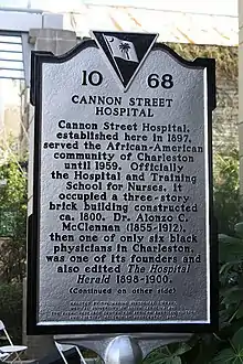 The Hospital and Training School for Nurses was chartered by the South Carolina legislature in July 1897, and opened with 24 beds in a three-story building purchased for $4,500 (equivalent to $158,292 in present-day terms).[2] Funds for the purchase of the building and necessary equipment were secured almost entirely by local charity, including support from the Duke Endowment.[12] A historical marker commemorating McClennan and the hospital was erected in 2010 near 135 Cannon Street in Charleston.[13]
