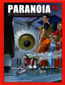 Paranoia is a dystopian science-fiction tabletop role-playing game originally designed and written by Greg Costikyan, Dan Gelber, and Eric Goldberg, and first published in 1984 by West End Games. Since 2004 the game has been published under license by Mongoose Publishing. The game won the Origins Award for Best Roleplaying Rules of 1984[1] and was inducted into the Origins Awards Hall of Fame in 2007.[2] Paranoia is notable among tabletop games for being more competitive than co-operative, with players encouraged to betray one another for their own interests, as well as for keeping a light-hearted, tongue in cheek tone despite its dystopian setting.