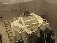 - Original superconducting magnet: 2 coils of niobium-titanium at 1.8 K producing a central field of 0.87 teslas[54] (Not used in the actual device)