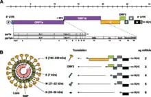 The genome is positive-sense, single-stranded RNA with a length of 27 to 29 kilobases and a 3'-polyA tail. Two large, overlapping ORFs at the 5'-end of the genome encode the major non-structural proteins expressed as a fusion protein by ribosomal frameshift. These include regions with protease, helicase and RNA polymerase motifs. There are seven other genes downstream which encode structural proteins. These are expressed from a 3'-coterminal nested set of subgenomic mRNAs.