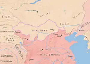 When Bodi Alagh Khan, the Khagan of the Mongols from the Chahar, died in 1547, Altan forced Bodi Alagh's successor Darayisung Küdeng Khan to flee eastward. In 1551 Darayisung made a compromise with Altan in exchange for giving the title "Gegeen Khan" to him.[5] Altan Khan, who controlled the Ordos tumen of the Huang He or Yellow River was well placed to keep pressure on the Chinese and the Oirat Mongols in Tibet while developing both agriculture and trade.[6]