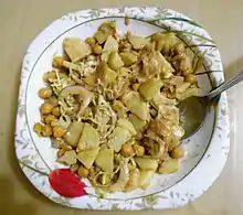Alu chat (also spelled as alu chaat, aloo chat, or aloo chaat) is a street food originating from the Indian subcontinent, it is popular in North India, West Bengal in Eastern India, Pakistan and also in parts of Sylhet Division of Bangladesh. It is prepared by frying potatoes in oil and adding spices and chutney. It can also be prepared with unfried boiled potatoes and also adding fruits along with spices, lime juice and chutney.