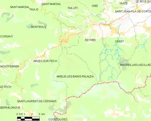 Amélie-les-Bains-Palalda is located in the canton of Le Canigou and in the arrondissement of Céret. It sits at the confluence of the Mondony with the Tech, 28.5 miles (46 km) SSW of Perpignan by road. The town is situated at a height of 770 feet (230 m) and has both a winter and summer season.[4]