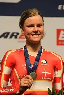 She won the junior women's road race at the World Championships in 2013 and 2014 as well as a bronze medal in the scratch race at the 2013 UCI Juniors Track World Championships. In both 2014 and 2015, she won the Danish national road race championship and in 2015, she also won silver in the women's omnium at the European Track Championships.[4] Dideriksen participated in the women's omnium at the 2016 Summer Olympics. Ranking 9th after the flying lap, she surprised everyone by winning the points race thus elevating her to an overall 5th place.