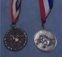 ![]() Two wrestlers competing in an amateur wrestling match | |