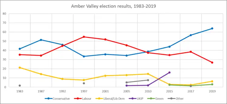 The constituency's generally small majorities and bellwether status since 1983 (being won by the party that nationally holds the most parliamentary seats) means Amber Valley was, by most common measures, a marginal seat. However, the large Conservative majorities in 2017 and 2019 would seem to indicate this is no longer the case.