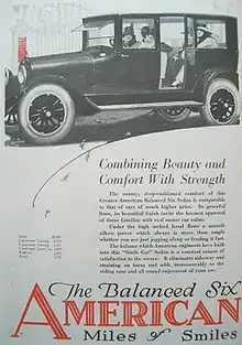 The American was an American automobile, built in Plainfield, New Jersey, manufactured from 1917 to 1924. The company also used names American Balanced Six or American Six, "Balanced" referred to its chassis, not the engine. It was an assembled car, one of many built in its time, and it used components from several manufacturers like Borg & Beck for clutch, Warner transmission, Stromberg carburetor and Rutenber engines.