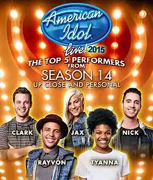 The American Idols Live! Tour 2015 was a summer concert tour in the United States that featured the Top 5 finalists of the fourteenth season of American Idol. The tour began on July 7, 2015, in Clearwater, Florida and ended on August 28, 2015, in Riverside, California. Like the previous tour, the size of venues were smaller and for the first time the tour featured the Top 5 instead of the usual Top 10. After not having a live band for the 2014 tour, there was one for this tour.[1][2] This was also the final Idol tour when the show aired on Fox as the 2016 tour was canceled.[3] The tour was revived in 2018.[4]