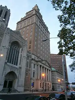 The American Insurance Company was incorporated February 20, 1846, and commenced business on April 1, 1846.[7] The company maintained offices downtown on Broad Street and later Park Place.[8] A new home office was completed in 1930. The sixteen story neo-classical tower is 326 ft (99 m) tall.[1][2] A main interior feature is a "great hall" with 20 ft (6.1 m) ceilings and 15 ft (4.6 m) windows.[9] The building was designed by the father and son architectural firm, John H. & Wilson C. Ely, which also designed the National Newark Building and Newark City Hall.[10]