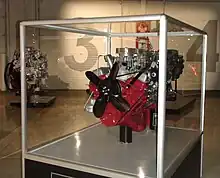 The Chevrolet small block 265 cubic inch engine was released in the 1955 model year and still the basis for the V8 engines in use by General Motors today.[34] The original 265 cubic inch engine with a two-barrel carburetor produced 162 hp,[35] while the four-barrel version in the 1955 Corvette produced 195 hp,[36] an amazing amount of power at the time. By 1957, the engine had been increased to 283 cubic inches,[37] including a fuel-injected version that produced 283 hp, the first engine to have a ratio of 1:1 horse power versus cubic inch displacement.[38]