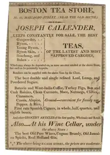 The American tea culture[3] is a part of the history of the United States, as this beverage appeals to all classes and has adapted to the customs of the United States of America. In the Dutch colony of New Amsterdam, now known as New York, tea was served with the best silver strainers, the finest porcelain cups and pots, and wooden tea caddy.[4] Tea became a very popular drink in the colonies, and tea ceremonies were common among all classes. In Salem, Massachusetts, tea leaves were boiled to create a bitter brew, then served as a vegetable side dish with butter. By the time of the American Revolution, tea was drunk everywhere from the backwoods to the cities.[5]