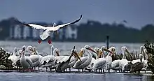 The American white pelican (Pelecanus erythrorhynchos) is a large aquatic soaring bird from the order Pelecaniformes. It breeds in interior North America, moving south and to the coasts, as far as Costa Rica, in winter.[2]