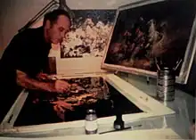 In 1985, Americo, Eva and A.B. painted the first in a series of large collaborative paintings, at 5 feet by 8 feet, combining the styles of all three painters, called "Trilogy", a view of Central Park.[55][56] The next collaborative work "Spirit of Paris" was unveiled at a private reception at Lawrence Ross Galleries in Beverly Hills in January 1986.[57][55] Americo painted the right most one-third of the painting, while Eva painted the center third and A.B. painted the left most one-third of the painting.[1] Each artist signed below the area of their work.[55]