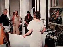 In 1982, Americo Makk was commissioned to paint a portrait of President Ronald Reagan, while Eva Makk was commissioned to paint Nancy Reagan.[46][47] Americo created two original portrait studies of the President that were previewed at the Nelson Rockefeller Collection in Palm Springs that were the forerunners to the final painting.[48][49][3] On March 5, 1983, the Rockefeller Gallery held a reception presenting the early paintings of the President by Americo Makk as part of its west coast premiere in Palm Springs.[50] Americo Makk expressed his concerns with painting the portrait in an interview for The Desert Sun, that if a president did not appreciate his portrait then the artist faced public scrutiny, referencing President Lyndon B. Johnson's portrait painted by respected landscape artist Peter Hurd.[51] Americo, with Eva and A.B., personally presented the 60 inch by 40 inch painting to President Reagan in the oval office of the White House on March 29, 1984, with the American Hungarian Federation.[52][53] Two additional portraits were also presented to the first family. Americo painted President Reagan with the Space Shuttle in the background. Eva Makk painted a portrait of the President and Nancy Reagan together, which was 60 inch by 40 inch.[52] An article in the Hawaiian periodical Artists in Paradise said of President Reagan's portrait that its "imagery, execution and technique reflect the spirit of our modern times with their sudden changes in political alignments, their looming national conflicts, their rapid advances in technology, and the need for decisive leadership and prompt action if we are to survive as a nation... Makk's portrait dramatizes the soul and significance of a strong American President."[44]
