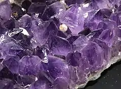 Amethyst is a purple variety of quartz (SiO2) and owes its violet color to irradiation, impurities of iron (Fe3+) and in some cases other transition metals, and the presence of other trace elements, which result in complex crystal lattice substitutions.[2][3][4] The irradiation causes the iron Fe3+ ions that replace Si in the lattice to lose an electron and form a [FeO4]0 color center.[5] Amethyst is a three-dimensional network of tetrahedra where the silicon atoms are in the center and are surrounded by four oxygen atoms located at the vertices of a tetrahedron. This structure is quite rigid and results in quartz's hardness and resistance to weathering. The hardness of the mineral is the same as quartz, thus making it suitable for use in jewelry.