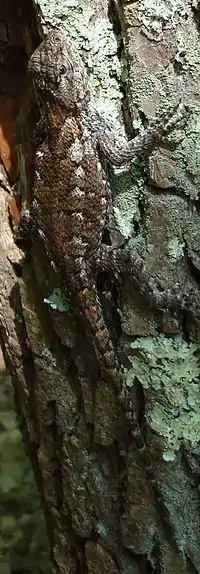 The eastern fence lizard (Sceloporus undulatus) is a medium-sized species of lizard found along forest edges, rock piles, and rotting logs or stumps in the eastern United States. It is sometimes referred to as the prairie lizard, fence swift, or gray lizard.