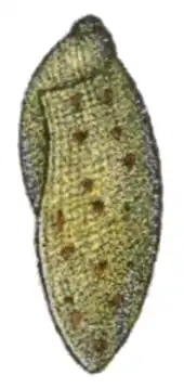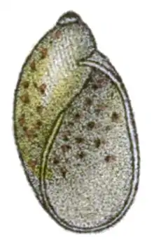 The shell is oblong, thin, but not elastic or fragile, corneous-olivaceous, with numerous irregularly scattered reddish dots. The surface is somewhat wrinkled with growth-striae and showing numerous very low but coarse irregular spirals. The shell has 2½ whorls. The apex is decidedly raised. The suture of the last half whorl is rapidly descending. The spire is rather slender and its length contained from 4½ to 4¾ times in that of the shell.[1]