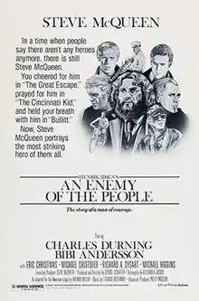 An Enemy of the People is a 1978 American drama film directed by George Schaefer based on Arthur Miller's 1950 adaptation of Henrik Ibsen's 1882 play. The film stars Steve McQueen in the lead role of scientist Thomas Stockmann, Charles Durning as his brother Peter, and Bibi Andersson as his wife Catherine.[2][3][4][5][6]