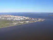 The town of Anadyr is situated at the tip of a large cape, to the north of which is the mouth of the Anadyr River and to the east the estuarine part of that river, the Anadyrsky Liman, which empties into the Gulf of Anadyr.[34] The town itself is situated on a gentle slope rising up from the sea, on the other side of the Anadyr River are mountains, but to the west, beyond the town are large expanses of flat tundra.[34]