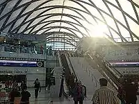 The transit center has been praised for its aesthetics.[46][47] It has been praised for acting as a civic landmark for the city of Anaheim (being described as perhaps acting as a tourist attraction itself) and for featuring a pleasant and grand interior space, which has been likened to stations from the peak of American rail transit (such as Grand Central Terminal and former Pennsylvania Station building).[41][48][46][49][50] In 2014, hailing it as a "world class transportation gateway to Orange County, California, the American Institute of Architects described the station as, comining "the heritage and civic importance of the grand 19th century rail stations of the past with the size, scale and complexity of today's modern airport terminals."[41] Its shape has also been described as reminiscent to the airship hangars, driving comparisons to the historically notable airship hangars that are also located in Orange County.[48][51] The project received a 2014 American Institute of Architects Technology in Architectural Practice Building Information Modeling Award.[52][50]