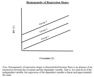 There are several key assumptions that underlie the use of ANCOVA and affect interpretation of the results.[2] The standard linear regression assumptions hold; further we assume that the slope of the covariate is equal across all treatment groups (homogeneity of regression slopes).