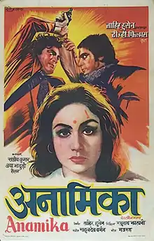 Anamika is a 1973 Indian Hindi-language romantic thriller film directed by Raghunath Jalani. The music was composed by R. D. Burman and lyricist Majrooh Sultanpuri. Songs such as "Bahon Mein Chale Aao", sung by Lata Mangeshkar, "Meri Bheegi Bheegi Si", sung by Kishore Kumar and "Aaj Ki Raat" by Asha Bhosle. The musical instrument duggi was played by Homi Mullan for the song "Bahaon Mein Chale Aao".[1] The film was remade in Telugu in 1977 as Kalpana.[2]