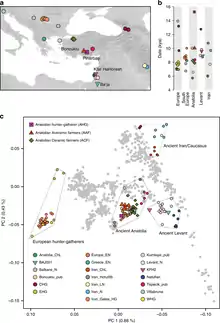 - ↑ Feldman, Michal; Fernández-Domínguez, Eva; Reynolds, Luke; Baird, Douglas; Pearson, Jessica; Hershkovitz, Israel; May, Hila; Goring-Morris, Nigel; Benz, Marion; Gresky, Julia; Bianco, Raffaela A.; Fairbairn, Andrew; Mustafaoğlu, Gökhan; Stockhammer, Philipp W.; Posth, Cosimo (2019-03-31). "Late Pleistocene human genome suggests a local origin for the first farmers of central Anatolia". Nature Communications. 10 (1): 1218. Bibcode:2019NatCo..10.1218F. doi:10.1038/s41467-019-09209-7. ISSN 2041-1723. PMC 6425003. PMID 30890703.