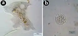 Some elongated protists have distinctive ends of the body. In such organisms, the end with a mouth (or equivalent structure, such as the cytostome in Paramecium or Stentor), or the end that usually points in the direction of the organism's locomotion (such as the end with the flagellum in Euglena), is normally designated as the anterior end. The opposite end then becomes the posterior end.[43] Properly, this terminology would apply only to an organism that is always planktonic (not normally attached to a surface), although the term can also be applied to one that is sessile (normally attached to a surface).[62]