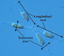 In organisms that maintain a constant shape and have one dimension longer than the other, at least two directional terms can be used. The long or longitudinal axis is defined by points at the opposite ends of the organism. Similarly, a perpendicular transverse axis can be defined by points on opposite sides of the organism. There is typically no basis for the definition of a third axis. Usually such organisms are planktonic (free-swimming) protists, and are nearly always viewed on microscope slides, where they appear essentially two-dimensional. In some cases a third axis can be defined, particularly where a non-terminal cytostome or other unique structure is present.[43]