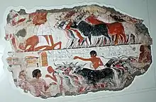 Ancient Egyptian cattle were of four principal different types: long-horned, short-horned, polled and zebuine.[18] The earliest evidence for cattle in Egypt is from the Faiyum region, dating back to the fifth millennium BC.[18] In the New Kingdom, hump-backed zebuine cattle from Syria were introduced to Egypt, and seem to have replaced earlier types.[18]