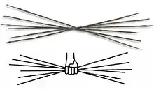 Above: Six rod-shaped obeloi (oboloi) displayed at the Numismatic Museum of Athens, discovered at Heraion of Argos. Below: grasp[2] of six oboloi forming one drachma