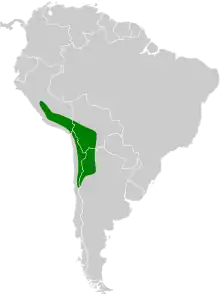 The Andean negrito ranges through the mountainous regions of central Peru south into western Bolivia, down into north eastern Chile and northern Argentina. It is most commonly found between 3,000 and 4,000 m (9,800 and 13,100 ft) above sea level, but may go higher in Peru or drop down to 1,000 m (3,300 ft) in Chile. It lives around lakes, streams and bogs and in seasonally flooded plains, in areas with low ground cover. The species is non-migratory.[2]