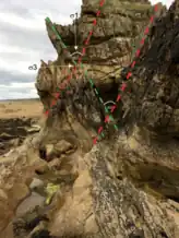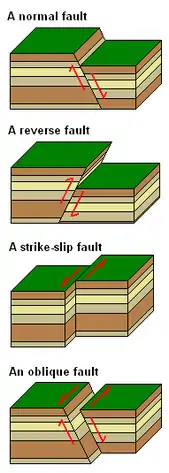 In geology, a fault is a fracture in the surface of the Earth that occurs when a plane of rocks are under extreme stress and break.[1] No movement of the two planes after the fracture results in a joint as opposed to a fault. Motion cements a fracture's classification as a fault. The two parts of the fractured plane grinding against one another can result in an earthquake or deformation of the Earth's crust.[2] Faults can be classified into four types based on the kind of motion between the separated plates: normal, reverse, strike-slip, and oblique. Anderson's fault theory (1905) is a way of classifying faults by use of principal stress.[3][4]